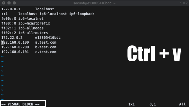 - Ctrl + v 입력 하단에 -- VISUAL BLOCK -- 모드 확인