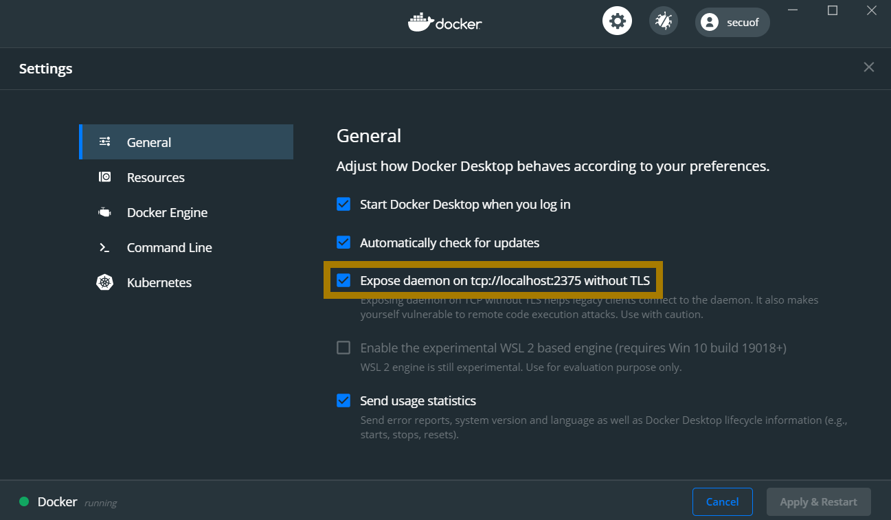 - Settings >> General >> "Expose daemon on tcp://localhost:2375 without TLS" checkbox check