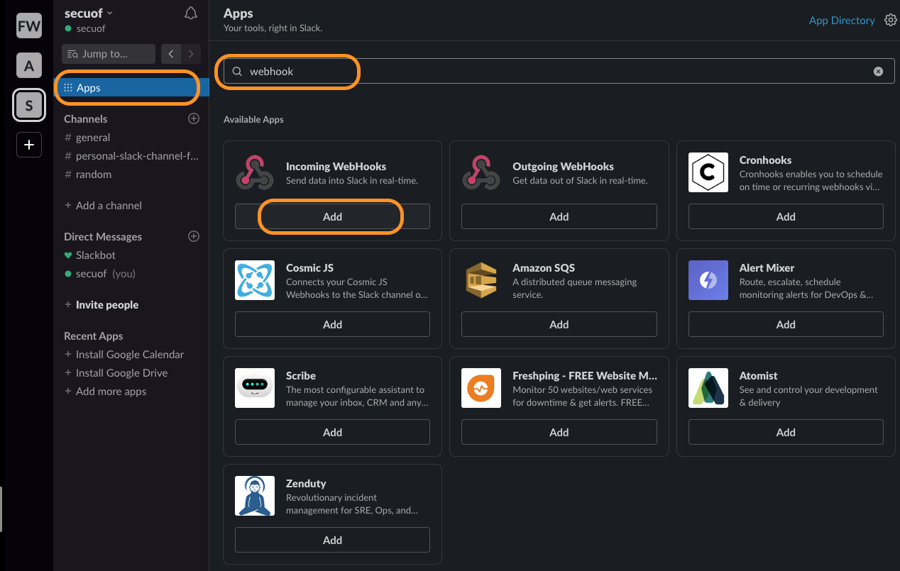 확인해 보면 "Outgoing WebHooks", "Cronhooks" 등등 여러가지 Alert App들을 볼수가 있다.
