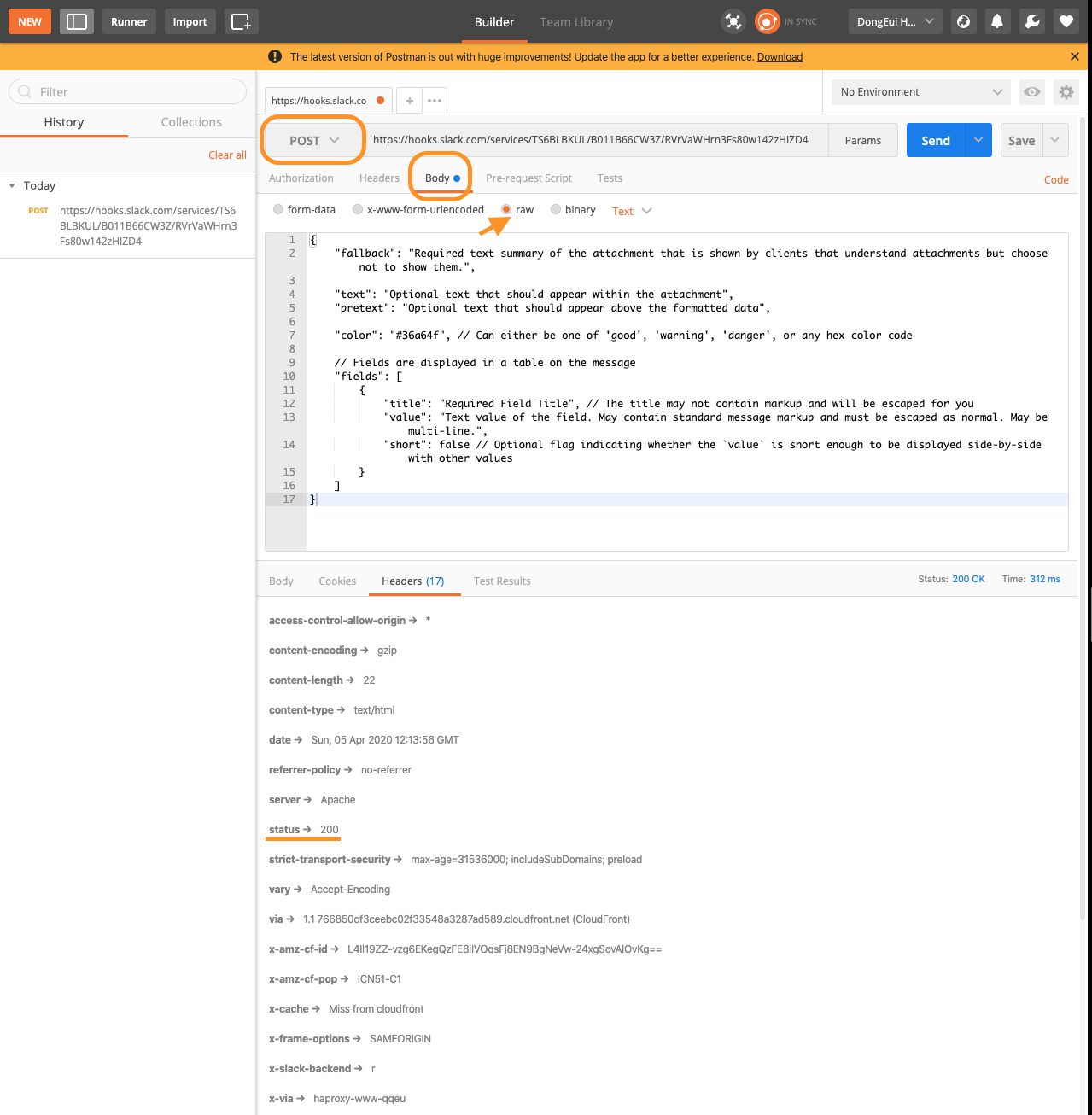 여러가지 테스트 방법이 있지만 여기서는 POST request에 Body는 Json foramt으로 Webhook URL에 요청할 것이다.