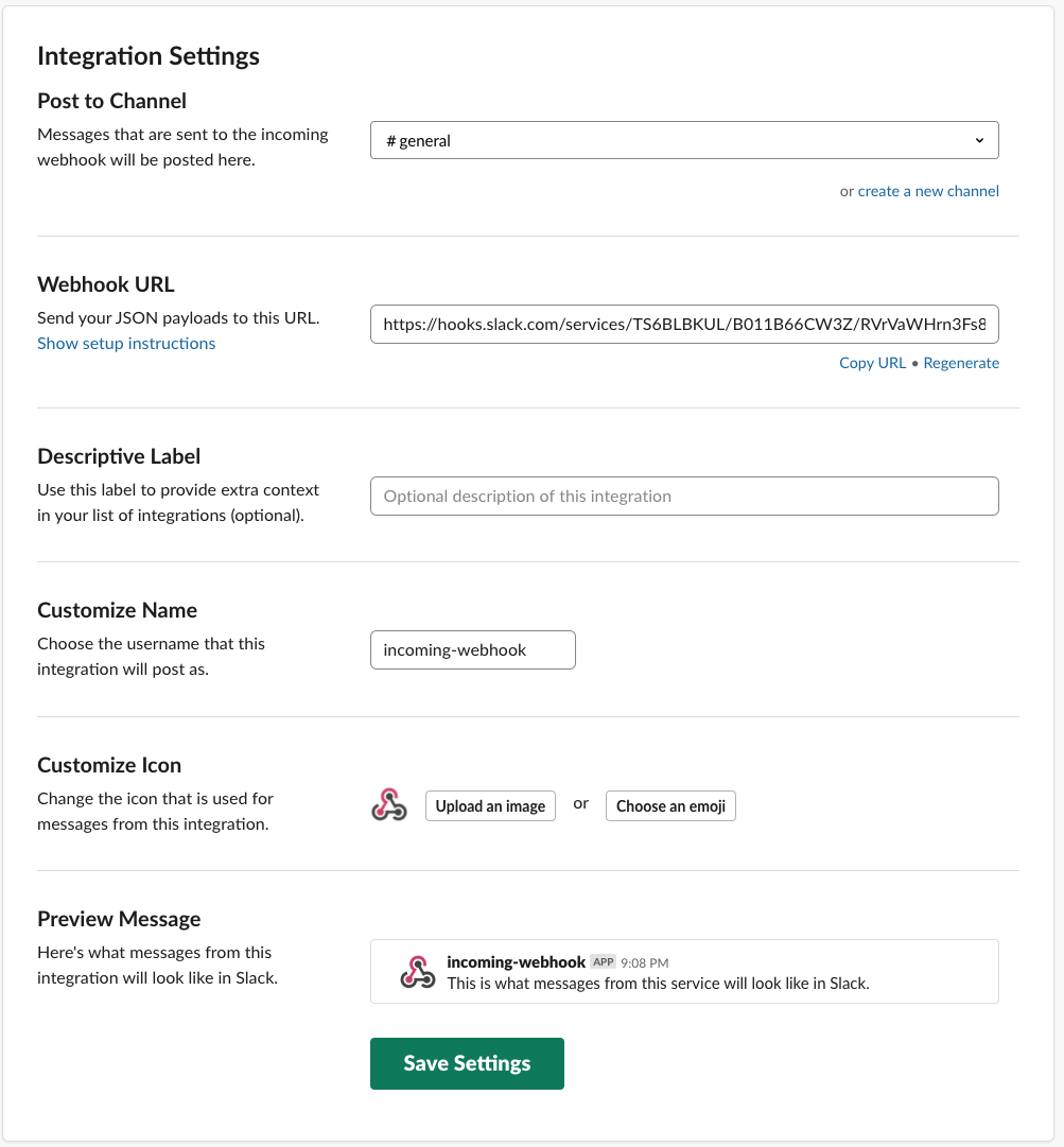 - Customize Icon: WebHook 리스트에 표시 및 보내는 메시지에 표시되는 Image 또는 emoji